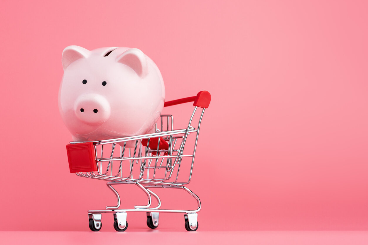 pink piggy bank with a shopping cart stands on a pink background online business shopping concept
