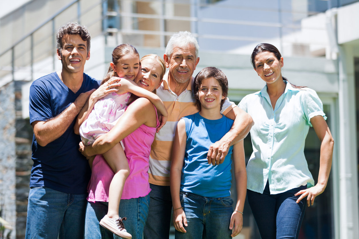 multi-generation family smile, standing in front of modern house, parents, senior grandparents and children