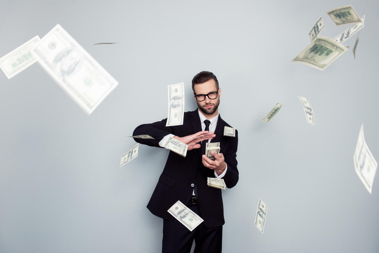 spectacles jackpot entrepreneur economist banker chic posh manager jacket concept handsome confident cunning clever wealthy rich luxury guy holding wasting stack of money isolated on gray background