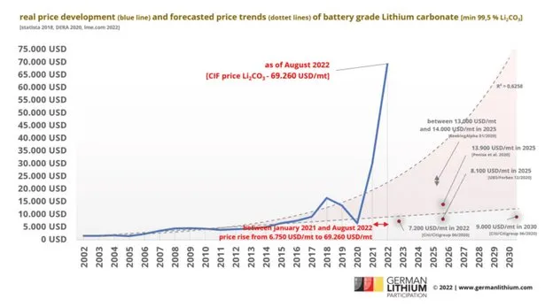 Selon son fondateur, l’hydroxyde de lithium produit dans la raffinerie alsacienne aura une intensité carbone 5 fois inférieure à celle des procédés classiques. L’argument est de poids dans un contexte d’augmentation exponentielle des coûts de l’énergie. Et, avec des prix qui devraient se maintenir à un niveau historiquement haut dans les prochaines années, les marges que pourront dégager les startups du secteur sont alléchantes.