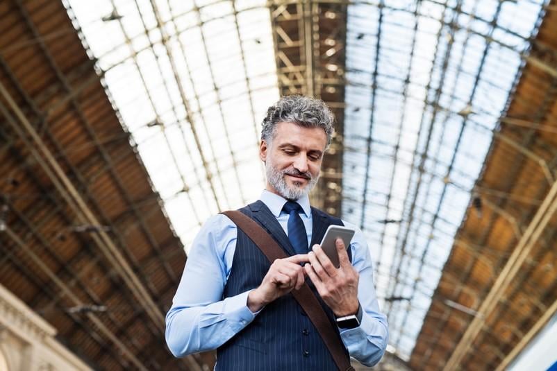 handsome mature businessman with smartphone in a city man waiting for the train at the railway station, text messaging