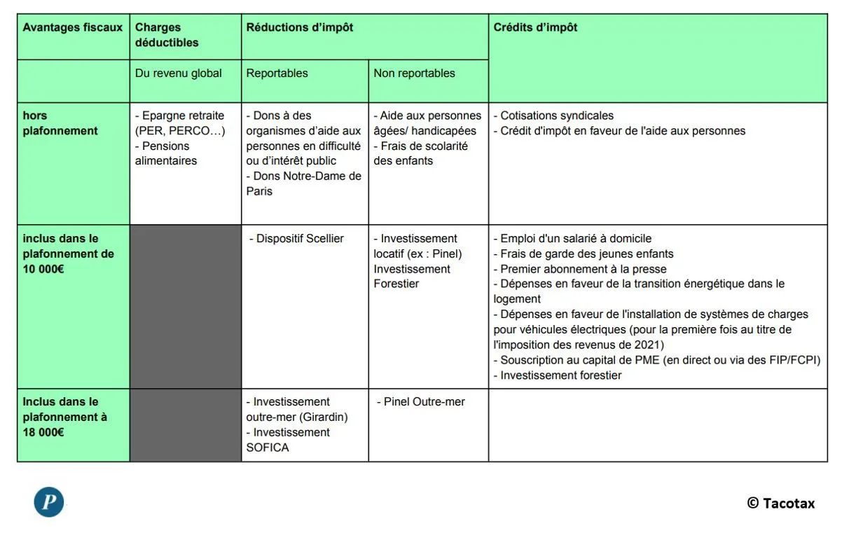 Vous trouverez ci-dessous un tableau récapitulatif des avantages fiscaux les plus courants et leur articulation avec le plafonnement global.