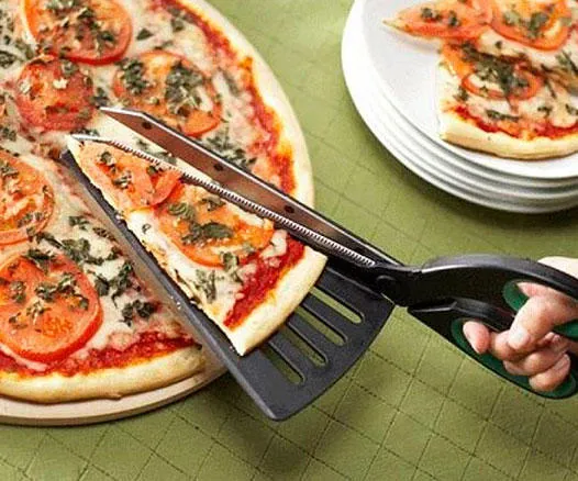 Et on commence avec un objet méconnu des amoureux de pizzas : les ciseaux à pizza ! Non seulement elles sont pratiques pour découper une part de pizza, mais elles font aussi office de spatule. Le prix de ce fabuleux gadget : 10,29 euros.