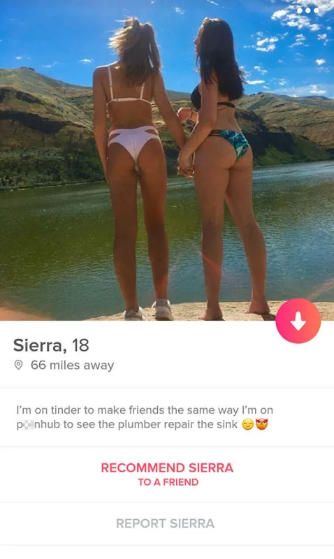 Traduction : "Je suis sur Tinder pour me faire des amis de la même façon que si j'étais sur un site coquin pour mater le plombier en train de réparer le lavabo."