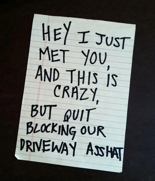Traduction : "Hey, ont vient de se rencontrer, et je sais que c'est fou, mais arrêtez de bloquer notre allée tr****c."
