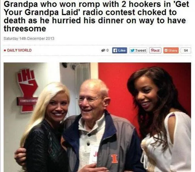 "En voulant se dépêcher, un grand-père meurt étouffé en dînant avant de passer une nuit torride avec deux prostituées après avoir remporté une soirée avec elles à une émission de radio"