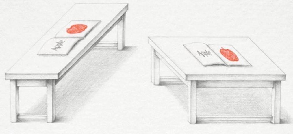 À première vue, les tables semblent être de tailles différentes. En effet, l'une a l'air longue, l'autre à l'inverse a plutôt une forme carrée. Mais en réalité les deux tables sont identiques. Appelée l'illusion de la table de Shepard, elle joue sur la perception de profondeur. Par ailleurs, le positionnement des tables (horizontal et vertical) contribue à l'illusion.