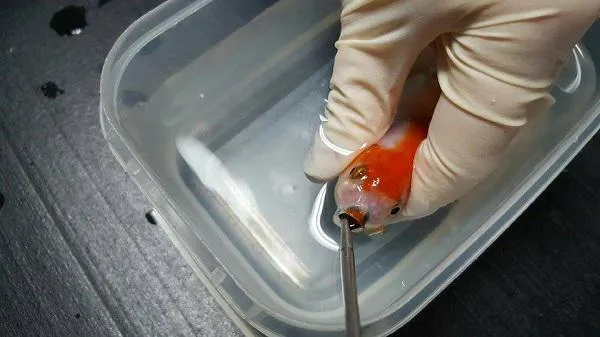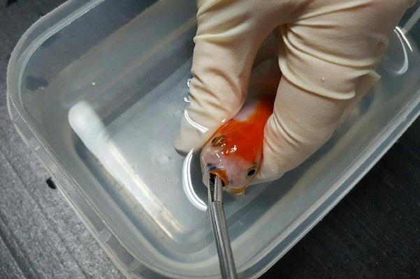 Le chirurgien a ensuite déposé quelques gouttes de produit anesthésiant dans l’eau du poisson jusqu’à ce que celui-ci s’assoupisse. Il s’est emparé d’une pince et a doucement ouvert la bouche de l’animal.