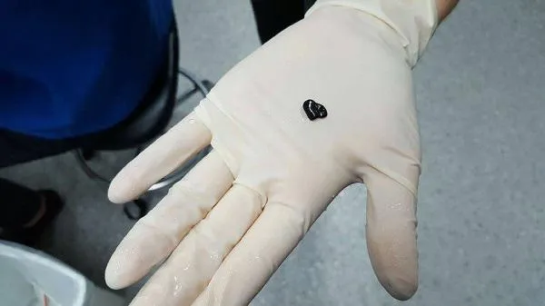 Solidement tenu par l’instrument, le caillou a pu être retiré, millimètre par millimètre, le long de la gorge du poisson.