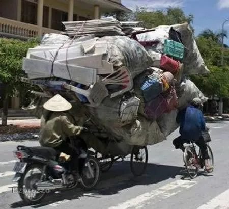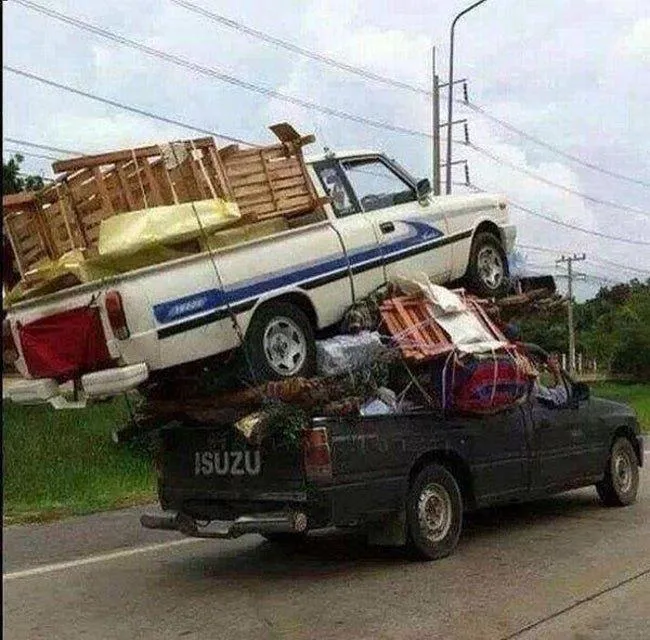 Un véhicule surchargé... transporté par un autre véhicule surchargé !