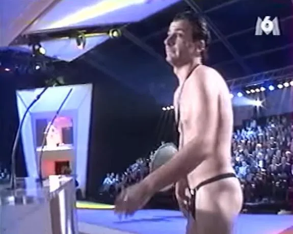 Michaël Youn a relevé un défi osé. En 2001 l'ex-animateur star de M6 a promis à la journaliste Daphnée Roulier sur Canal+ qu'il allait apparaître quasiment nu à la cérémonie des 7 d'or. Chose promise, chose due : l'humoriste débarque en string sur scène avec un mégaphone et fait le tour du plateau en criant le célèbre slogan de son émission Le Morning Live.