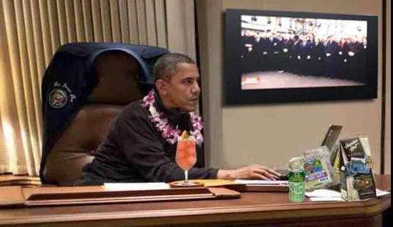 Obama regarde le rassemblement à la télé... avec un cocktail et un collier hawaïen