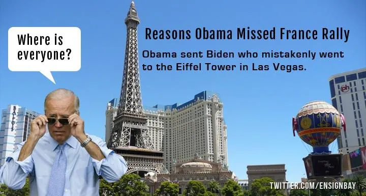 "Obama a envoyé Biden qui est allé par erreur à la Tour Eiffel de Las Vegas" dit cette image. "Où est tout le monde ?" s'interroge Joe Biden.
