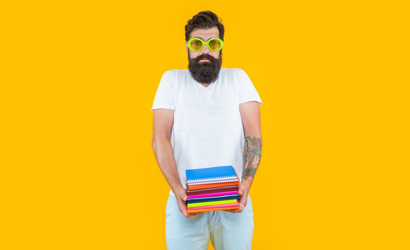amazed man student with heavy book stack for school man in glasses hold school book stack isolated on yellow background education of man student back to school self education of man student