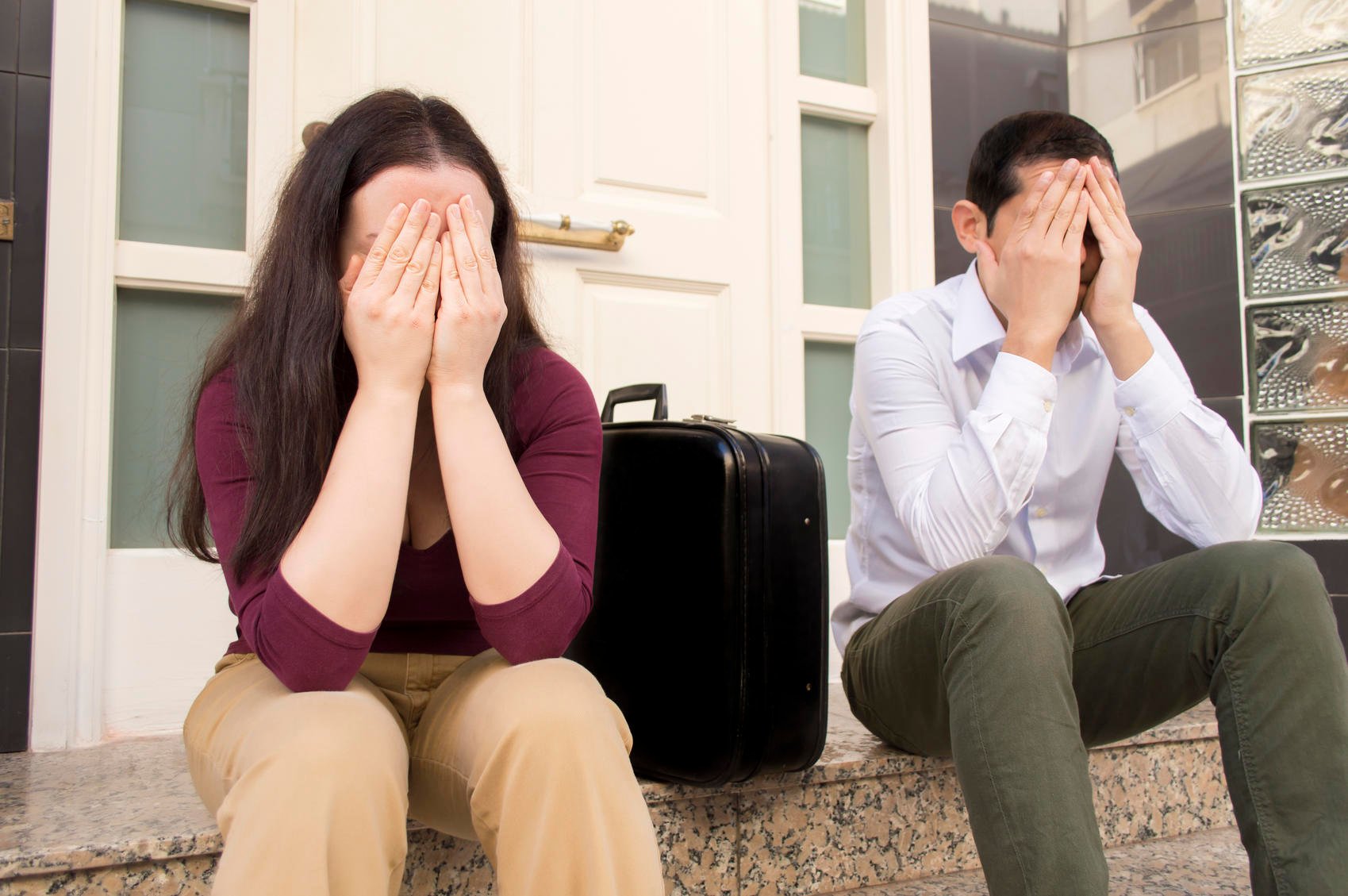 couple assis et pleurer à la porte avec la valise à cause de l'expulsion