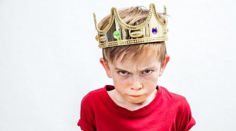 irritated beautiful spoiled boy with frowning freckles and a dirty look wearing a golden crown for mad attitude facing parenthood and education, white background, indoors