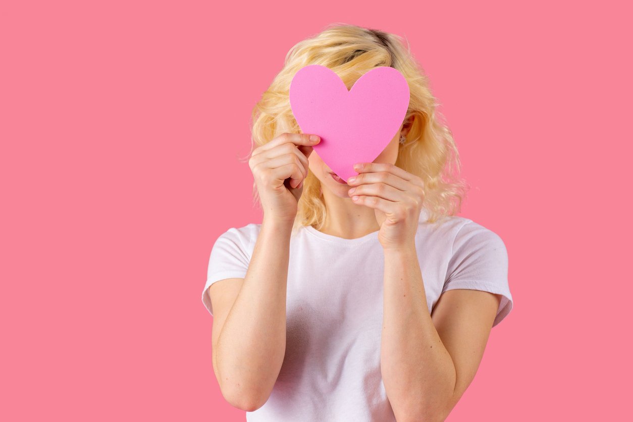 studio portrait of a young woman holding pink heart covering head, love and dating concept