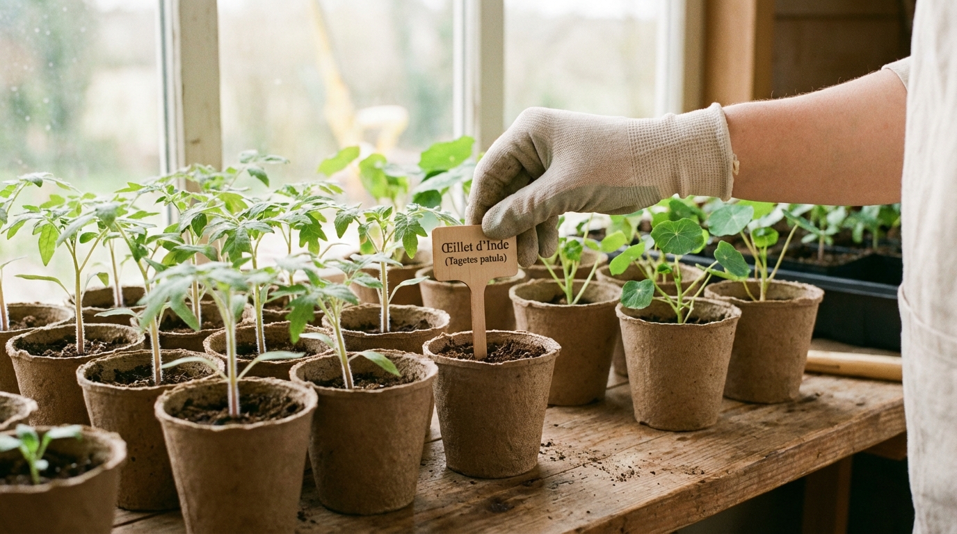 - L'Œillet d'Inde (Tagetes patula) : C'est le bouclier anti-nématode par excellence, à placer près des tomates. Il nécessite environ 6 à 8 semaines d'avance pour être opérationnel.