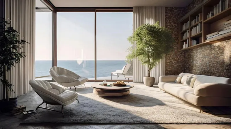 Le salon de cette maison de rêve devrait attirer votre attention : la vue sur mer, une luminosité complète, le tout dans un cadre épuré.