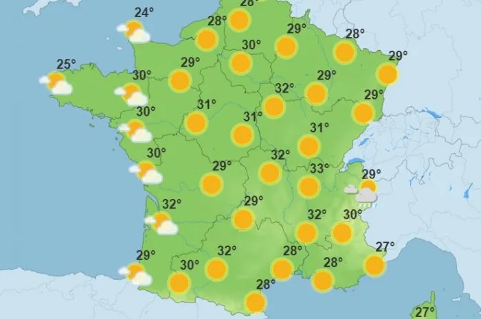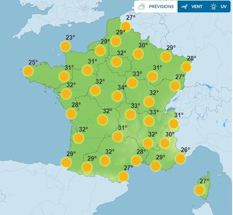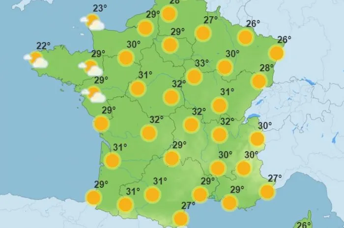 Une matinée légèrement plus fraîche dans le sud-est, puis une météo d'après-midi toujours très chaude, avec des pics à 33°C dans le Centre-Val-de-Loire et la Bourgogne-Franche-Comté. Quelques nuages font leur retour par la pointe de la Bretagne et sur la Normandie.
