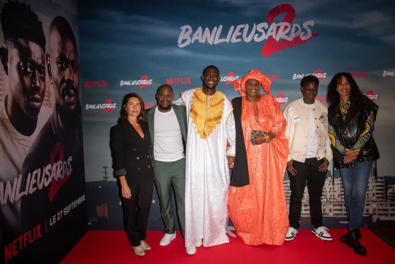 Alessandra Sublet prenant la pose avec les comédiens du film Banlieusards 2 à Paris, le 14 septembre 2023.