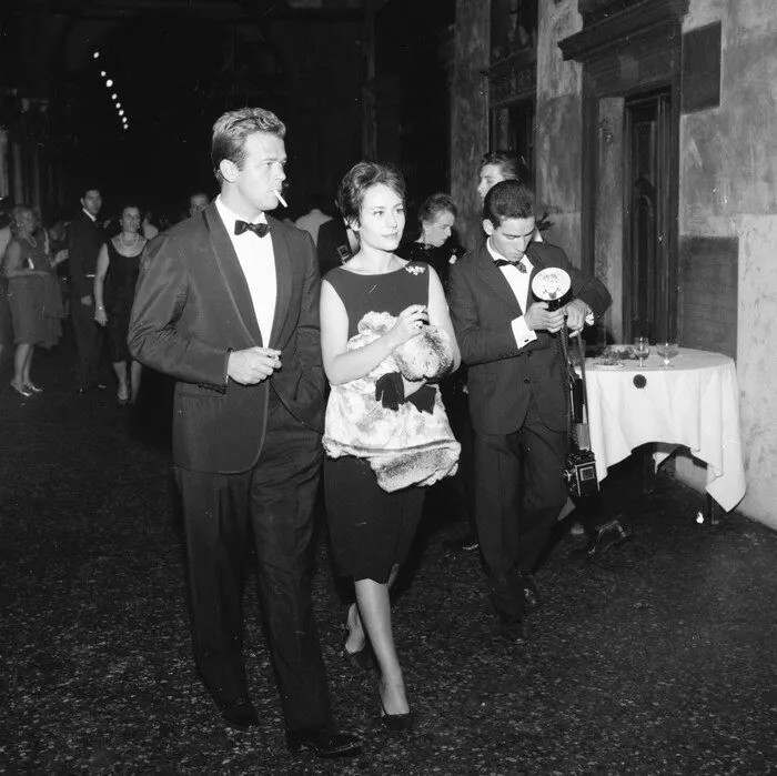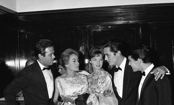 Annie Girardot aux côtés d'Alain Delon et sa fiancée Romy Schneider à la Mostra de Venise.