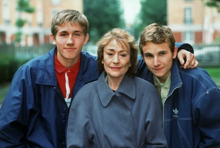 La comédienne Annie Girardot prenant la pose avec le jeune acteur Lorant Deutsch sur le tournage du film La façon de le dire en 1999.