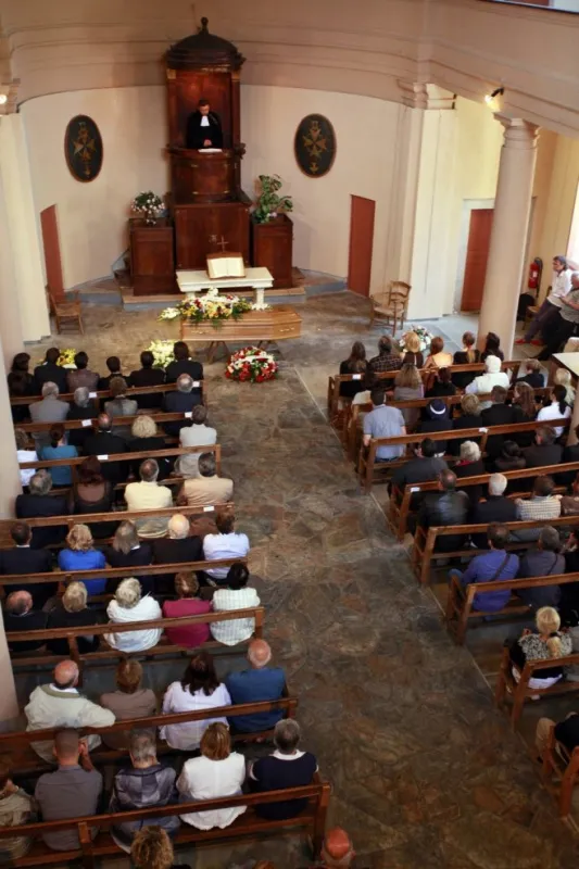 Les proches de la comédienne sortant du temple après les obsèques au temple Saint-Andre de Valborgne.