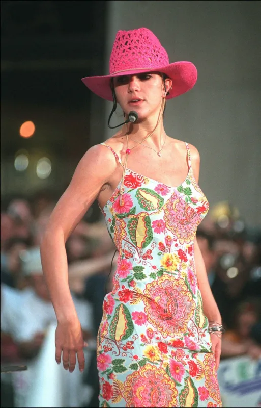 La chanteuse Britney Spears dans un look très atypique : chapeau de cow-boy rose et robe fleurie.