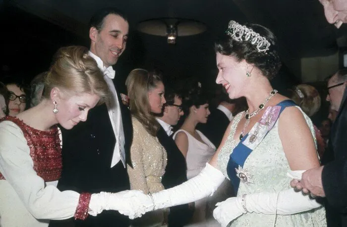La comédienne Catherine Deneuve, âgée de 23 ans, et la reine Elizabeth II en 1966.