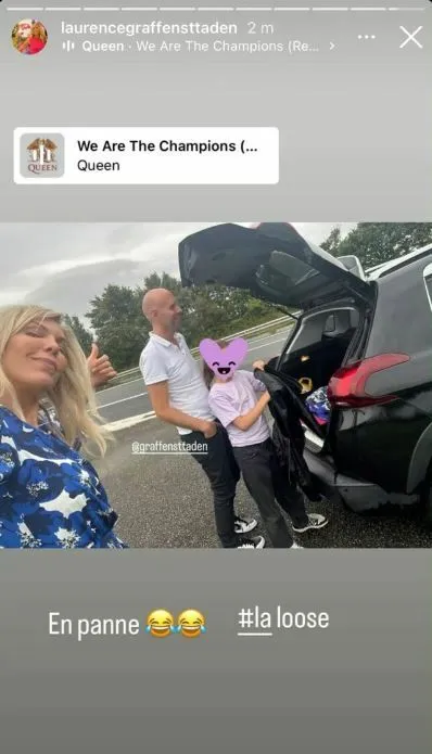 La journée avait pourtant bien commencé pour la petite famille. Laurence Auzière a visité la célèbre cathédrale d’Amiens et a profité d’une balade en famille dans les rues de la ville. Sa fille Alice a même trouvé son bonheur dans une librairie locale. Mais un imprévu sur la route est venu tout bouleverser. Sur son compte Instagram, Laurence a posté une story montrant le coffre de sa voiture ouvert, accompagné de la légende : "En panne. #la loose", avec en fond sonore la chanson We Are the Champions de Queen.