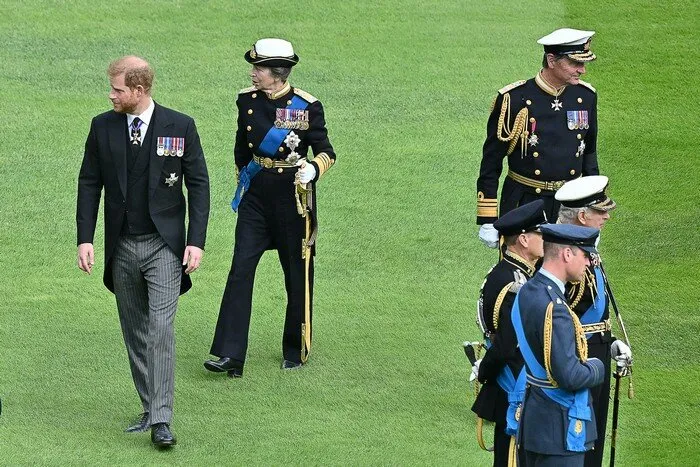 Le prince Harry en marge de son frère et de son père lors des obsèques de la reine Elizabeth II.