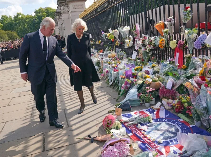 Le roi Charles III et son épouse, la reine consort, Camilla, admirant les fleurs déposées en l'honneur d'Elizabeth II devant Buckingham Palace.