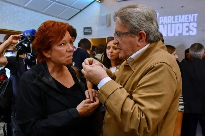 La comédienne Éva Darlan discutant avec le leader de La France Insoumise, Jean-Luc Mélenchon.