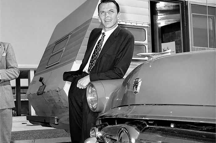 Le chanteur Frank Sinatra photographié à côté d'un camping-car en 1955 à Hollywood.