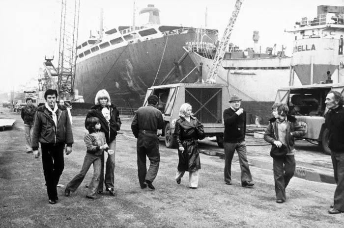 Alain Delon, son fils Anthony et Mireille Darc lors d'une pause sur le tournage du film Borsalino and Co en 1974.