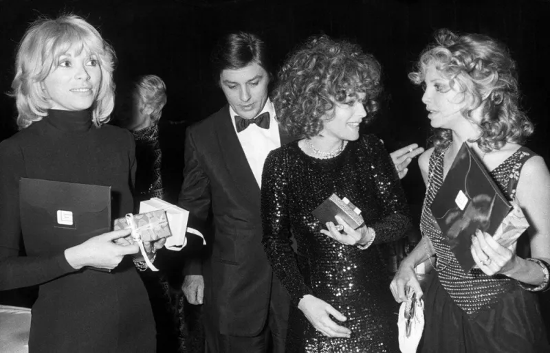 Les comédiennes Mireille Darc et Romy Schneider au côté d'Alain Delon au Lido à Paris en 1977.