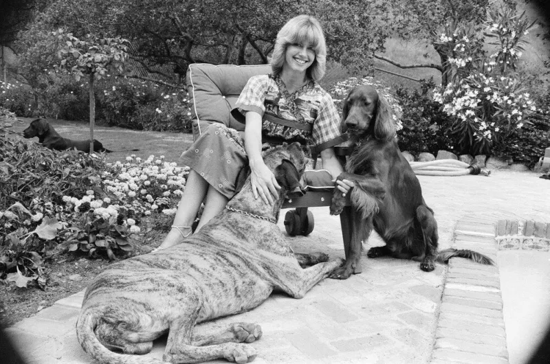 Olivia Newton-John photographiée dans sa demeure de Malibu aux côtés de ses deux chiens en 1976.