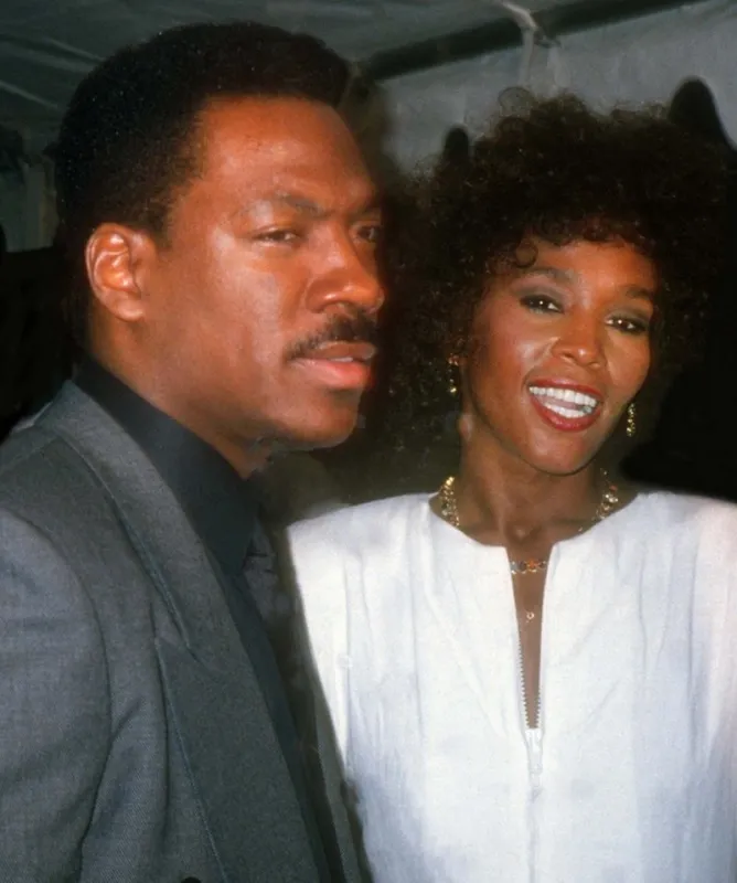 Les deux stars américaines Eddie Murphy et Whitney Houston posaient ensemble devant les photographes environ dans les années 1980.