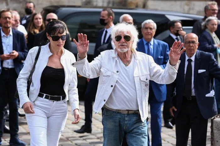 Hugues Aufray et son épouse lors des funérailles de Jean-Paul Belmondo.