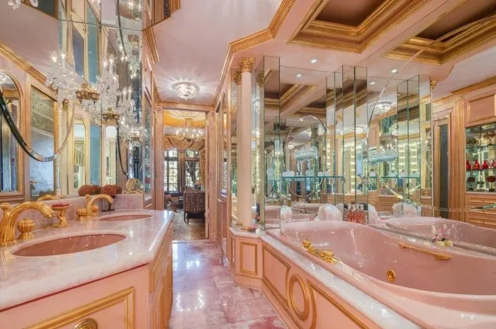 La demeure possède cinq salles de bain dont celle-ci qui est en marbre rose.