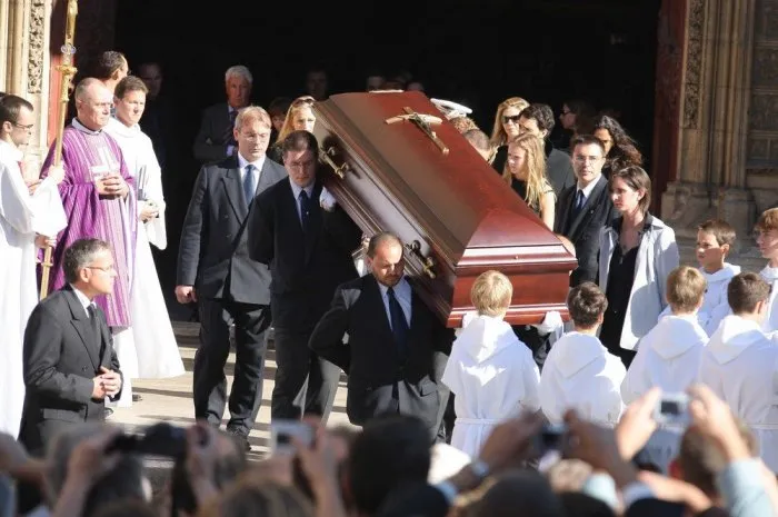 Le cercueil de Jacques Martin quittant la Cathédrale Saint-Jean à Lyon.