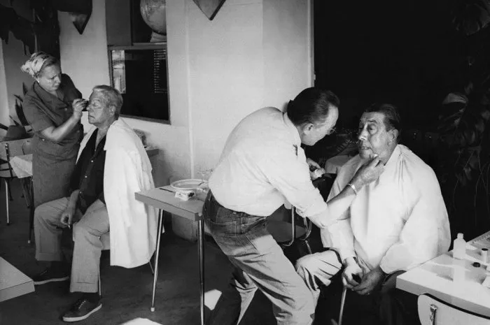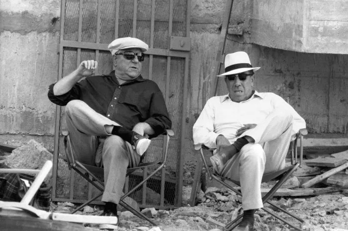 Jean Gabin et Fernandel dans les coulisses du film L'ingrat en 1964.