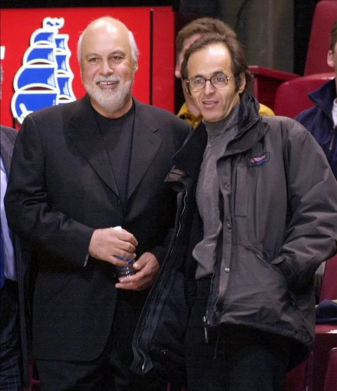 Le célèbre chanteur a composé de nombreuses chansons pour Céline Dion. Une proximité artistique et amicale qui le liait également au mari de la diva canadienne, René Angelil, comme ici où ils assistaient à un match de hockey entre les Canadiens de Montréal et les Bruins de Boston.