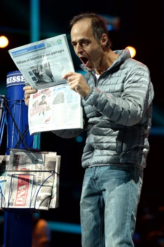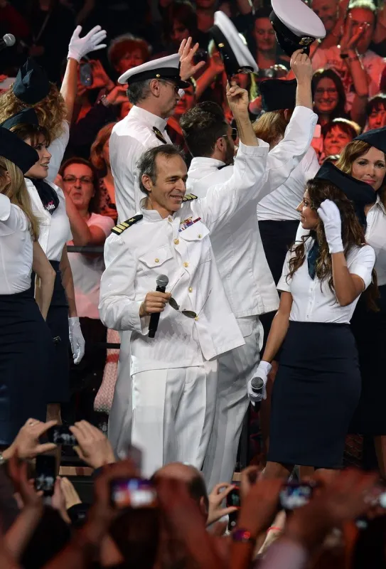 Le chanteur français, déguisé en steward, sur scène avec la troupe lors de l'émission musicale "Les Enfoirés", qui s'est tenue en janvier 2014 à Strasbourg.