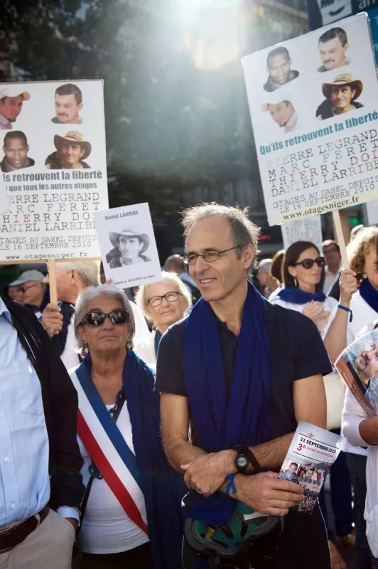 L'artiste Jean-Jacques Goldman participait à une marche avec des manifestants à Marseille, dans le sud de la France en septembre 2013, appelant à la libération de quatre otages français enlevés en 2010 au Niger.