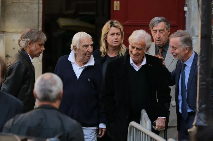 Jean-Paul Belmondo, son fils, Pierre Vernier et Charles Gérard lors des funérailles de Jean Rochefort.
