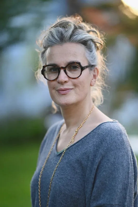 La comédienne Armelle Lesnial, star de la série Caméra Café, canon les cheveux blancs.
