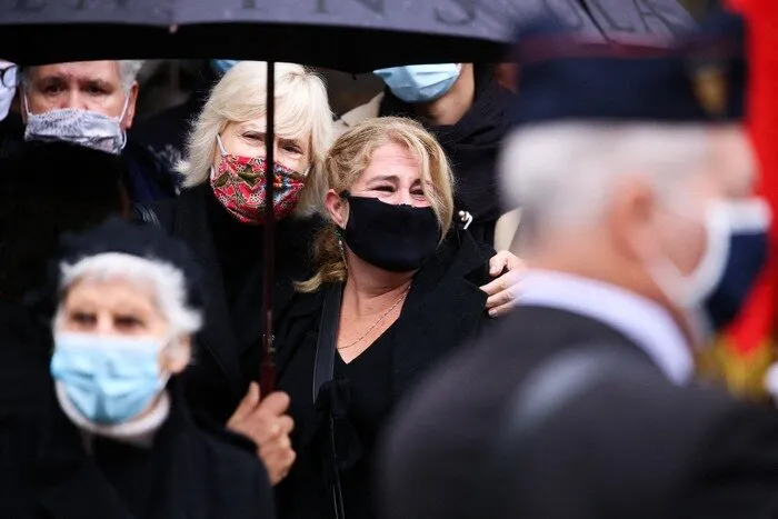 Catherine Ceylac réconfortant Julie-Amour lors des obsèques de Juliette Gréco en 2020.