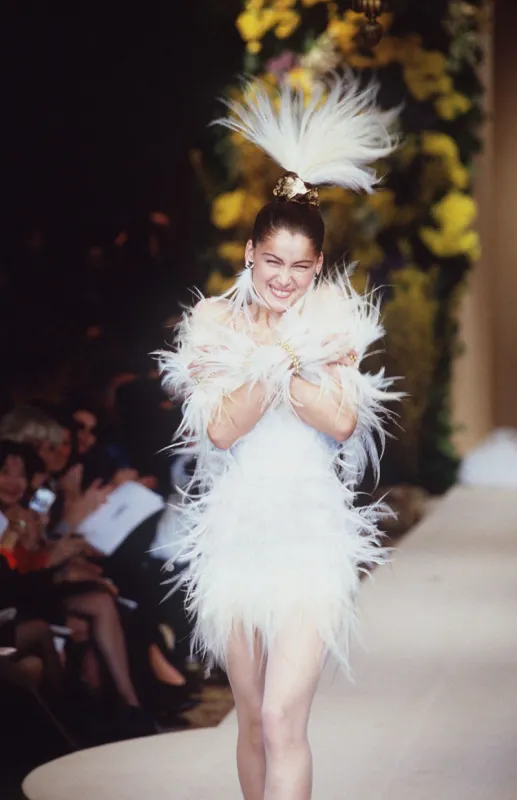 En 2000, la célèbre actrice et mannequin a défilé dans une sublime robe à plumes signée Yves Saint-Laurent.